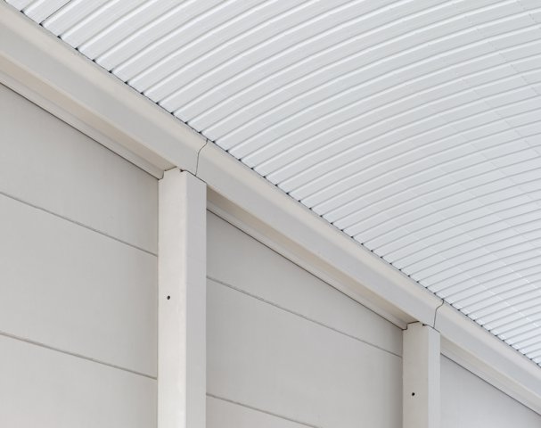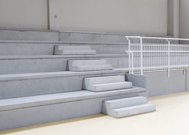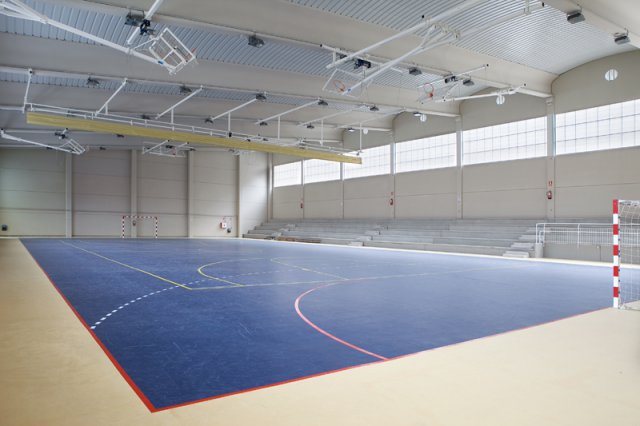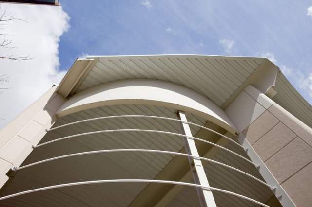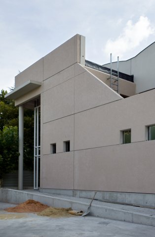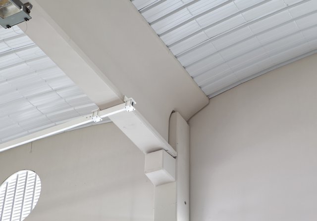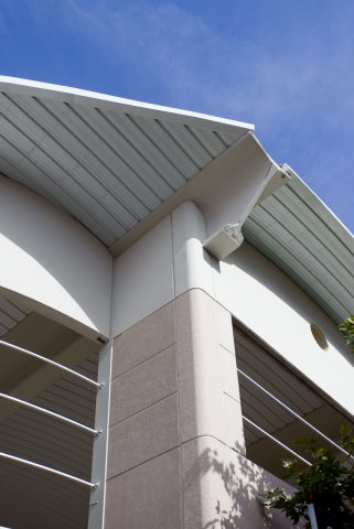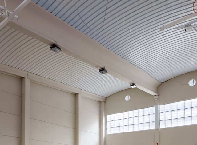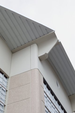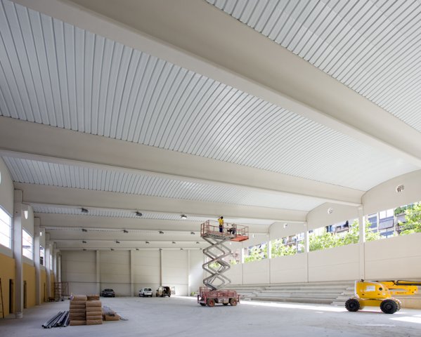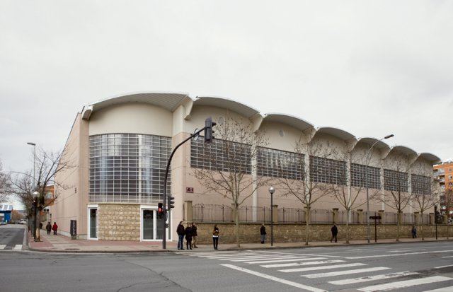 Edificio formado por pilares, vigas Ypsilon, vigas en T invertida y forjado nervado. Terminación panel: Rojo alicante corregido chorreado.