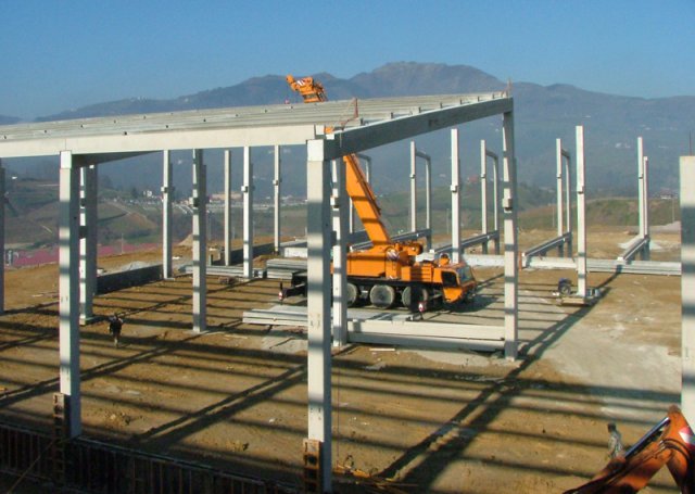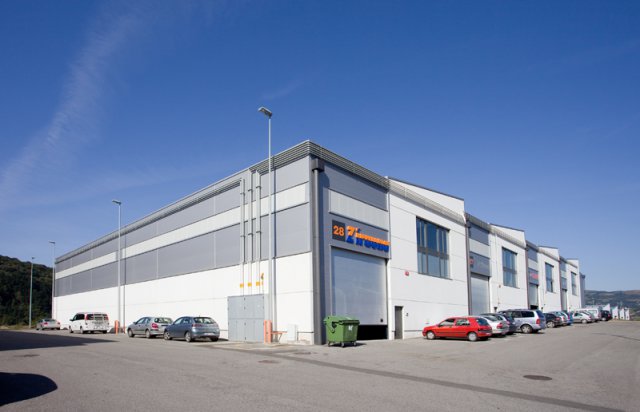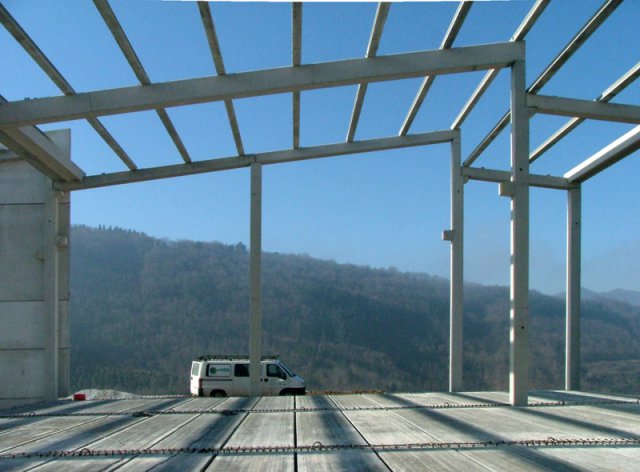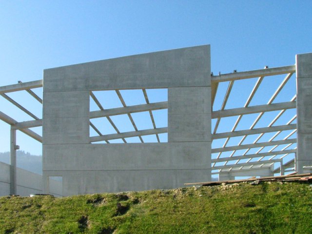Bâtiments constitués de piliers, poutres delta, poutres en T inversé et planchers. Finition des panneaux : Blanc Macael aspect granuleux.